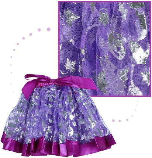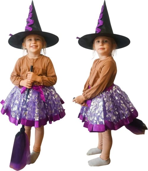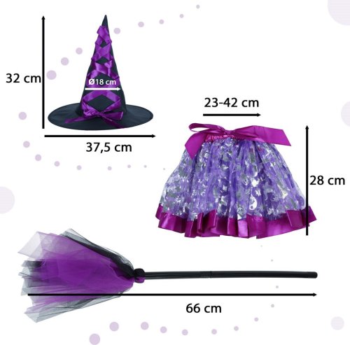 Balení obsahuje: fialovou sukni čarodějnický klobouk skládací koště