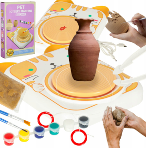 kreativní sada pro děti, která inspiruje k tvůrčí činnosti, obsahuje vše potřebné – hlínu, kruh, dekorační nástroje, elektrické hrnčířské kolo – snadné a plynulé tvarování hlíny, rozvíjí kreativitu a jemnou motoriku – podporuje vývoj dítěte hrou kompletní kreativní sada – hlína, nástroje, barvičky a dekorace, bezpečné a intuitivní ovládání – navrženo speciálně pro děti, probouzí fantazii, učí trpělivosti a umožňuje vytvářet skutečná umělecká díla,