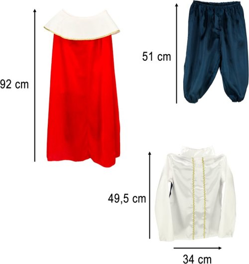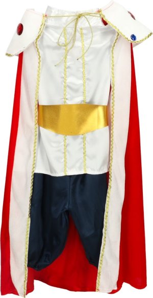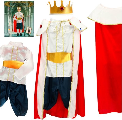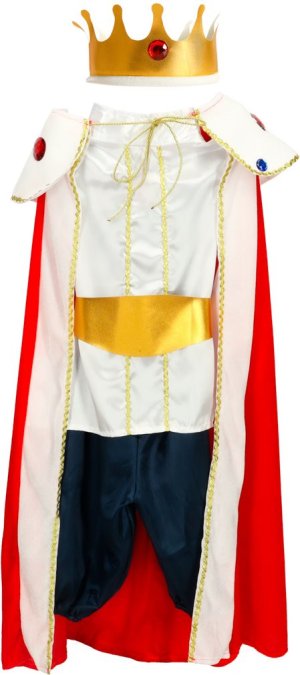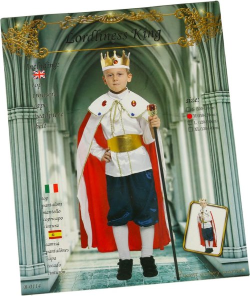 Kostým ve velikosti M (110-120 cm). Sada obsahuje: košili, kalhoty, plášť, opasek a královskou korunu.
