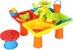 1x stůl + 1x stolička 1x mlýnek na vodu nebo písek 1x mlýnek se skluzavkou 2x lopatky, 1x hrábě, 1x sítko, 2x formičky 1x loď, 1x mini kbelík, 1x mini konvička na zalévání 1x spojka na stůl 1x návod k obsluze