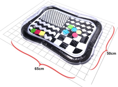 Nafukovací smyslová podložka s kontrastním černobílým vzorem, který přitahuje pozornost. Uvnitř podložky jsou plovoucí barevné geometrické tvary, které hravě zaujmou miminka.