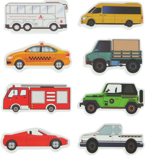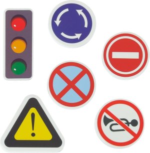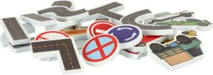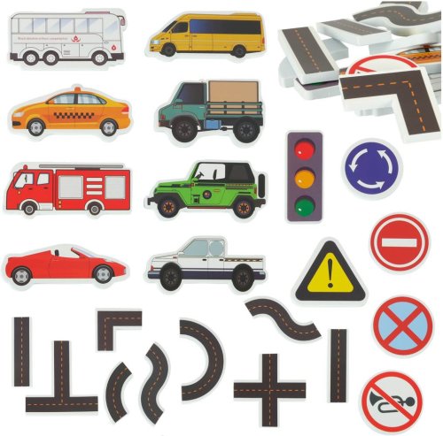 Sada obsahuje 23 pěnových puzzlí s obrázky roztomilých dopravních značek.