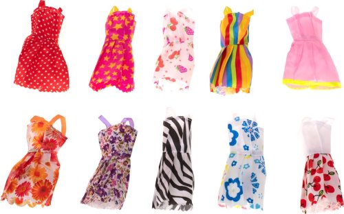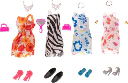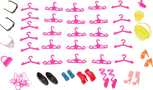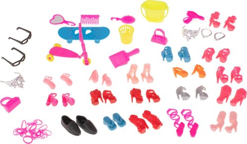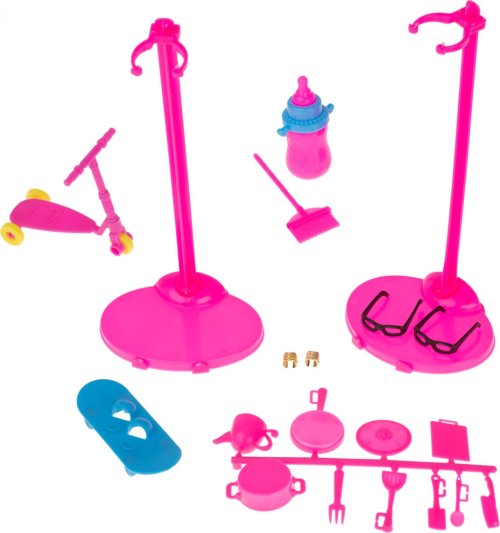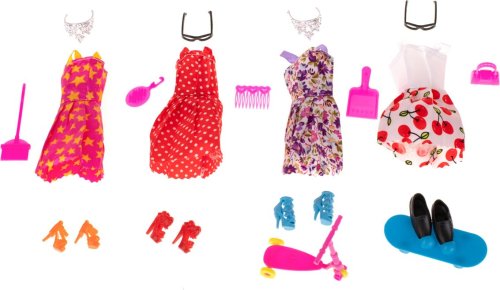 Sada obsahuje: 10 ks šatiček pro panenky (délka 13 cm), brýle, kabelky, střevíčky, boty, korunky, věšáky, koloběžku, skateboard, příbory aj.