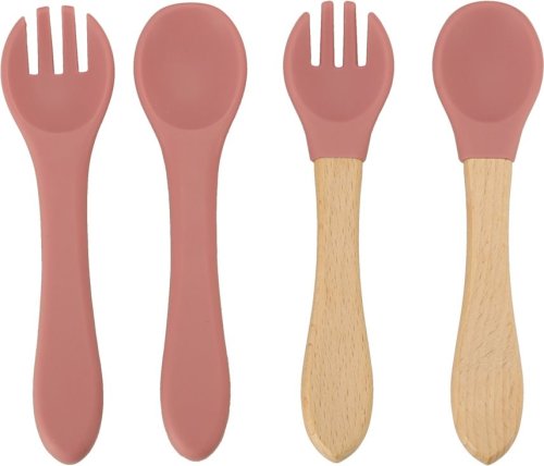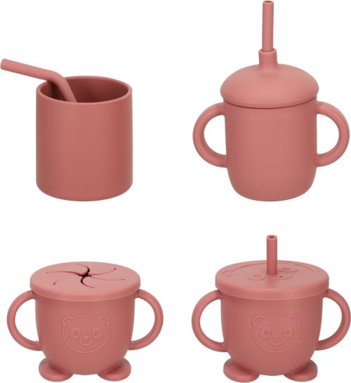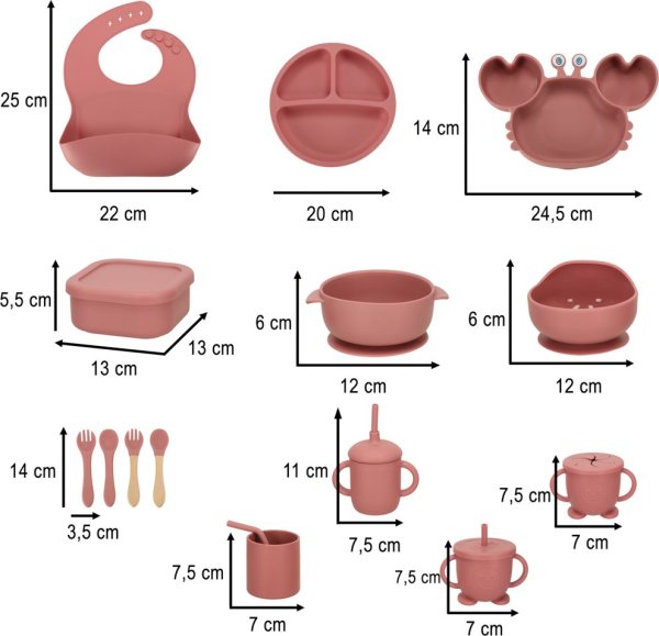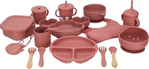 Sada obsahuje: misky, talířky, příbor, bryndák, hrníčky s víčkem, krabičku a dudlík. Misky obsahují přísavku.