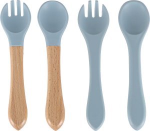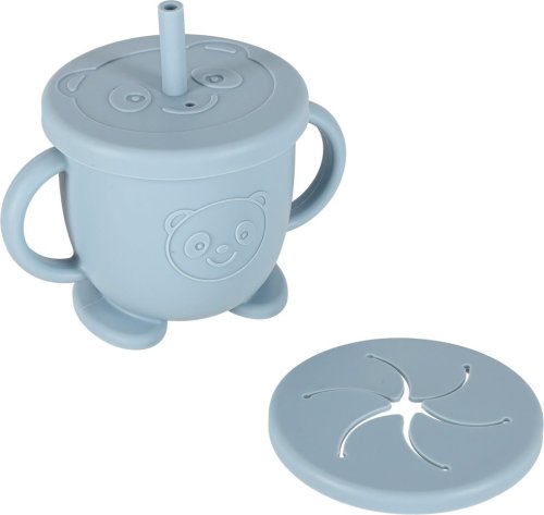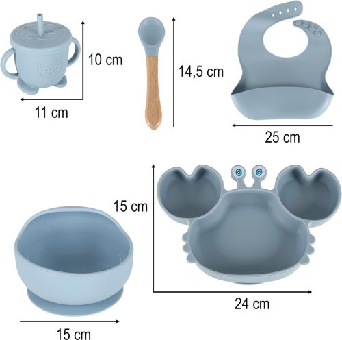 silikonový talíř ve tvaru kraba s přísavkou, silikonová miska s přísavkou, hrníček se dvěma víčky (včetně víčka s brčkem), silikonová lžička a vidlička, první dětská lžička a vidlička, silikonový nastavitelný bryndák.