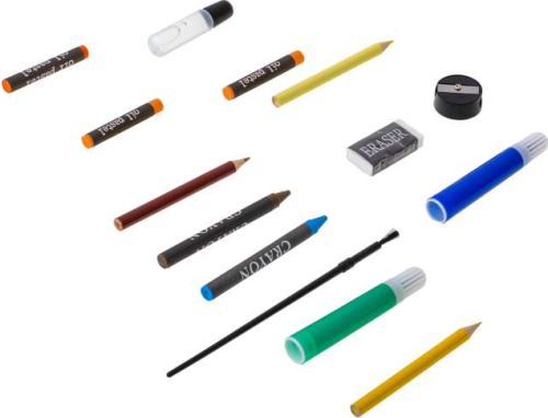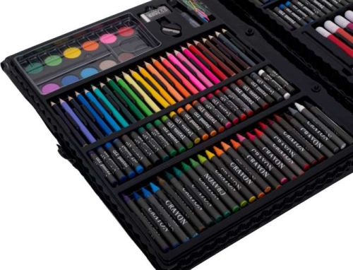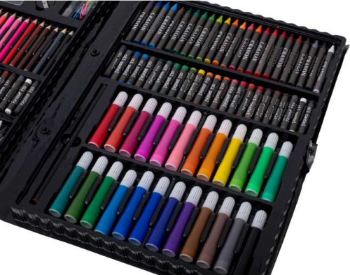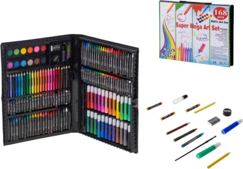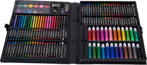 Velká malířská souprava pro děti v plastovém kufříku. Sada obsahuje: 24 fixů, 24 pastelek, 48 voskovek, 48 olejových pastelů, 12 akvarelových barev, ořezávátko, gumu, štětec, lepidlo, 9 kancelářských spon. Vhodné pro děti od 3 let.