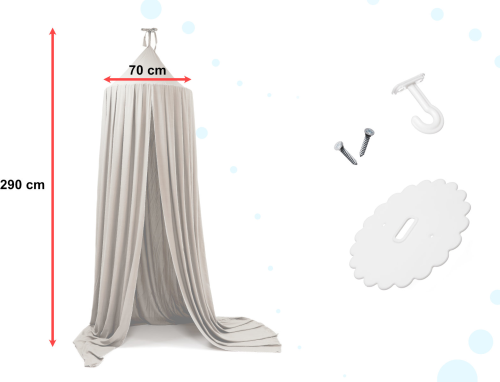 Závěsný baldachýn KIK nejen krásně vypadá, ale zároveň poskytuje dětem klidný spánek. Tento elegantní a funkční dekorativní prvek zútulní každou dětskou místnost. Snadno se instaluje, balení obsahuje všechny potřebné komponenty. Zavěšený nad postýlkou vytváří bezpečnou a příjemnou atmosféru, která usnadňuje usínání a chrání dítě před vnějšími podněty. Baldachýn také výborně poslouží jako stan – ideální skrýš pro plyšáky, auta, panenky nebo místo pro odpočinek a čtení. Obsah balení: