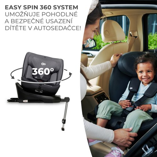EASY SPIN SYSTEM 360° Systém EASY SPIN 360° usnadňuje nejen připoutání dítěte do autosedačky pomocí vnitřních pásů. Umožňuje také rychlou změnu nastavení (RWF a FWF) bez nutnosti vyjmutí celé autosedačky z vozidla. Jednoduše odjistíte bezpečnostní pojistku a otočíte sedačku směrem k sobě, abyste do ní mohli dítě snadno usadit a připoutat, nebo otočit sedačku po směru jízdy.