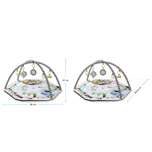 Hrací deka pro děti od narození. V sadě 7 hraček s různými estetickými a kognitivními vlastnostmi: zrcadlo, šustící kniha, 2 kousátka, pískací tygr chrastítko a zvonicí slon.