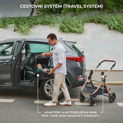 TRAVEL SYSTEM ESME je navržen tak, aby vám usnadnil společné procházky i cestování. V balení proto naleznete adaptéry a autosedačku MINK PRO 2 i-Size – díky nim vytvoříte TRAVEL SYSTEM, který oceníte na cestách. Dítě usnulo v autě? Žádný problém: vyjměte autosedačku, nacvakněte ji na rám kočárku – a můžete pokračovat! Autosedačka MINK PRO 2 i-Size je model RWF (proti směru jízdy) pro nejmenší děti. O bezpečnost pasažéra se starají pokročilé systémy jako H-GUARD+ a SPS+. Poloha RWF je navíc až 5× bezpečnější než poloha po směru jízdy.