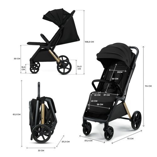 Maximální nosnost košíku: Do 5 kg Rozměry v rozloženém stavu: 72 x 57,3 x 114 cm Rozměry ve složeném stavu: 33 x 57,3 x 61,5 cm Rozměry sedáku: 37 x 22 cm Rozměry opěradla: 31 x 50 cm Opěrka na nohy: 35 x 23 cm Celková délka sedáku (v poloze na ležení): 93,5 cm Výška sedáku (od země): 50 cm Kolesa (přední/zadní): 16,5 / 24,5 cm Výška rukojeti pro rodiče: 108,5 cm Rozměry košíku: 35 x 43,5 x 22 cm Hmotnost kočárku: 9 kg