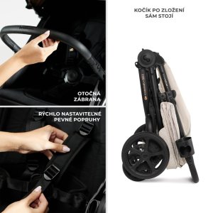 Rychlé skládání MITZY se skládá do kompaktní velikosti jednou rukou. Systém skládání dovnitř chrání látku sedáku před znečištěním. Kočárek je lehký, takže jej snadno vynesete po schodech, a jeho kompaktní rozměry ve složeném stavu vám umožní uložit kočárek do auta spolu se zavazadly.