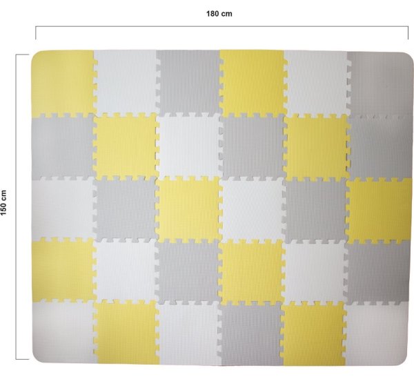 Praktická a pohodlná pěnová podložka z 30 puzzlí, které lze spojovat libovolným způsobem. Je určena k zábavě pro vaše dítě. Může na ní ležet nebo na ní dělat první kroky. Neutrální, kontrastní barvy puzzlí jsou dokonalým dekorativním prvkem místnosti. Jsou vyrobeny z pěny, jsou bezpečné a neobsahují škodlivé substance což je potvrzeno testy z nezávislé laboratoře INTERTEK. Navíc se snadno udržují čisté. V sestavě je též taška k přechovávání puzzlí.