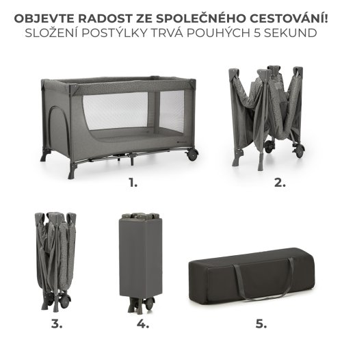 JOY 2 se složí za 5 sekund do kompaktní velikosti. Tato postýlka je lehká a zároveň velmi pevná, má také praktickou přenosnou tašku s rukojetí, ideální na cesty .JOY 2 je také ideální pro každodenní používání. prostoru a v případě potřeby lze snadno složit a uložit do skříně.