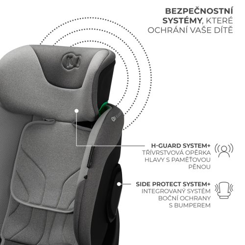 H-GUARD+, SPS+ Sedačka je vybavena 2 systémy, které zajišťují bezpečnost cestování na nejvyšší úrovni. H-GUARD+ je zesílená třívrstvá opěrka hlavy s dodatečnou pěnou. Tato konstrukce chrání hlavu a krční část páteře, protože ještě lépe absorbuje energii vznikající při nárazu, a zároveň zvyšuje pohodlí jízdy tím, že se přizpůsobuje individuálnímu tvaru hlavy dítěte. Systém SPS+ je naopak vylepšený systém boční ochrany - potahy byly doplněny o nárazníky, které se chovají jako deformační zóna ve voze a dále zpevňují konstrukci sedačky v klíčových bodech. Převezmou na sebe první a nejsilnější sílu nárazu, rozptýlí ji a udrží mimo tělo dítěte.