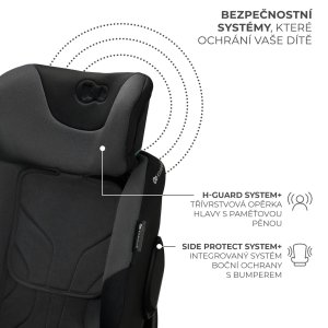 H-GUARD+, SPS+ Sedačka je vybavena 2 systémy, které zajišťují bezpečnost cestování na nejvyšší úrovni. H-GUARD+ je zesílená třívrstvá opěrka hlavy s dodatečnou pěnou. Tato konstrukce chrání hlavu a krční část páteře, protože ještě lépe absorbuje energii vznikající při nárazu, a zároveň zvyšuje pohodlí jízdy tím, že se přizpůsobuje individuálnímu tvaru hlavy dítěte. Systém SPS+ je naopak vylepšený systém boční ochrany - potahy byly doplněny o nárazníky, které se chovají jako deformační zóna ve voze a dále zpevňují konstrukci sedačky v klíčových bodech. Převezmou na sebe první a nejsilnější sílu nárazu, rozptýlí ji a udrží mimo tělo dítěte.