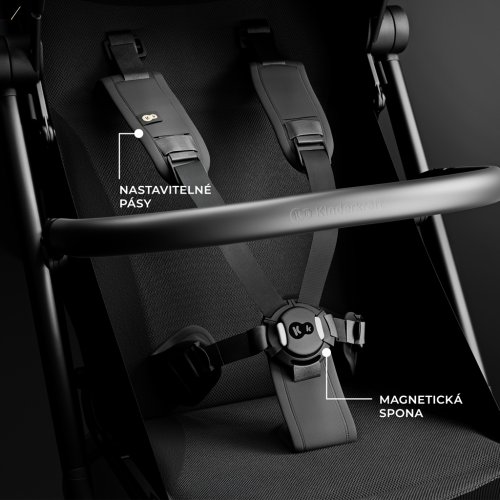 Pohodlné bezpečnostní pásy Magnetické, pětibodové bezpečnostní pásy zaručují bezpečnost a snadné používání - zapnutí a odepnutí trvá jen chvíli. Bezpečnostní pás je také vybaven pohodlným výškovým nastavením, které vám umožní přizpůsobit jej výšce dítěte nebo tloušťce oblečení, aniž byste jej museli znovu zapínat. Otočné madlo, které lze z obou stran odebrat, navíc usnadňuje nakládání a vyjímání dítěte z kočárku a poskytuje rodičům maximální komfort.