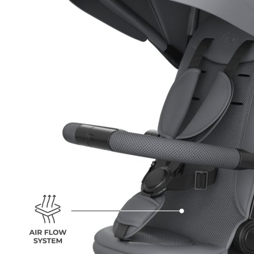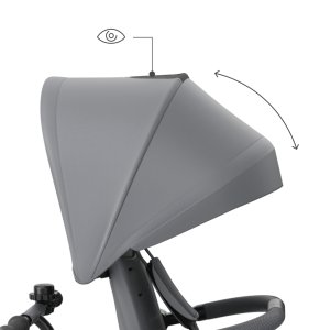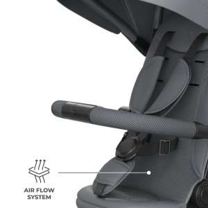 Na delších trasách výrazně pomáhá pololežící poloha, dostupná jak po směru jízdy, tak proti směru jízdy. Když dítě únavou zavře oči, rodič rychle sklopí opěrku a pokračuje v procházce bez narušení denního rytmu. Při jízdě proti směru jízdy může dítě odpočívat a vidět na pečující osobu, což často usnadňuje zklidnění a zajišťuje maximální pocit bezpečí. Pohodlí doplňují ventilované vložky AIR FLOW a nastavitelná stříška s okénkem - snadno ji přizpůsobíte počasí a během jízdy na dítě vidíte.