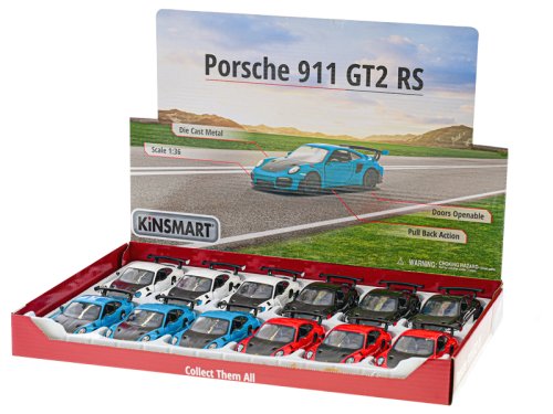 Kinsmart Porsche 911 GT2 RS 1:36 kov 12,5 cm na zpětný chod - mix barev (červená, modrá, bílá, černá)