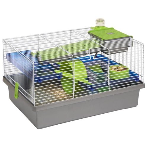 Plastová vícepatrová klec pro syrské křečky a křečíky s vybavením. Je vhodná také pro většinu myší a křečíků od 6 – 8 týdnů věku. Drátěná klec Pico, poskytuje různé prolézačky a skrýše. Snadný přístup do zavěšeného domečku a plnění napáječky z vnější části klece. Velmi jednoduché čištění, všechny části v prostoru jsou ke kleci připevněny, zásobník může být odebrán a vyčištěn. Boční a horní přístup do klece. Vybavení: napáječka, miska na krmení, domeček, schodiště a tiché kolečko na cvičení. Rozměry: 50 × 36 × 31 cm Rozteč mezi dráty: 1 cm Barva: stříbrná/modrá/hrášková