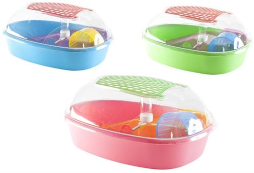 Vybavený plastový box pro drobné hlodavce. Ve stropě plastová dvířka s větracími otvory. Vybavení: prostorný plastový úkryt sloužící zároveň jako další patro klece se schůdky a prohlubní místo misky, napáječka, kolotoč. Rozměry: šířka 52cm, hloubka 38cm, výška 24cm