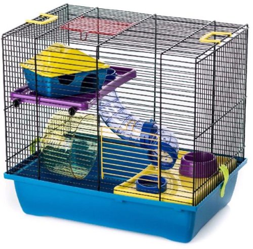 Vyšší klec s plastovou výbavou vhodná pro křečky a další drobné hlodavce. Vybavení: 2 patra, domek, kolotoč, 1 miska, 2 menší a 1 větší tunel spojitelné k sobě. Rozměry: 43 x 28 x 38 cm (šířka x hloubka x výška)