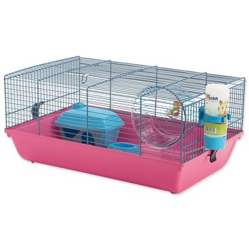 Klec je vybavená plastovým domečkem, miskou na krmení, kolotočem a napaječkou.