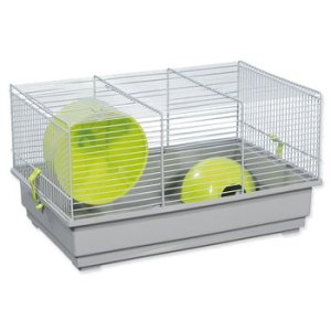 Klec pro myši a jiná malá zvířata s výbavou. Součástí je domeček a kolečko na běhání.