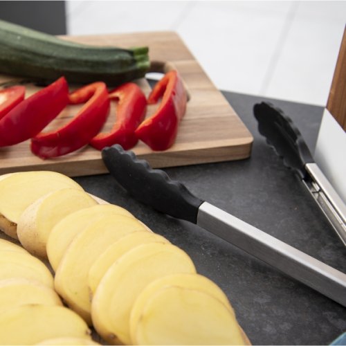Praktické děrované kleště / obracečka na maso, saláty, pečivo apod. Vhodné použít i při grilování. Jednoduchou manipulací závěsného očka dochází k uzavření kleští. Čelisti jsou vyrobeny ze silikonu odolného teplotám až do 230°C. Rukojeť kleští je kovová. Délka 27 a šířka 4 cm. EAN 8592381150853