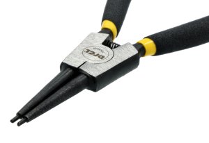 Kleště na vnější pojistné kroužky - vnější kroužky používáme na osách a hřídelích. Stisknutím se průměr kroužku zvětší a pak je možno tento kroužek nasadit nebo sejmout.