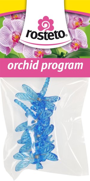 Dekorativní klipsy ve tvaru vážky slouží k uchycení květního stvolu orchidejí k opěrné tyčce. Jsou balené po 4 ks v igelitovém sáčku s EURO závěsem - pro možnost zavěšení na stojan.