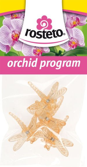 Dekorativní klipsy ve tvaru vážky slouží k uchycení květního stvolu orchidejí k opěrné tyčce. Jsou balené po 4 ks v igelitovém sáčku s EURO závěsem - pro možnost zavěšení na stojan.