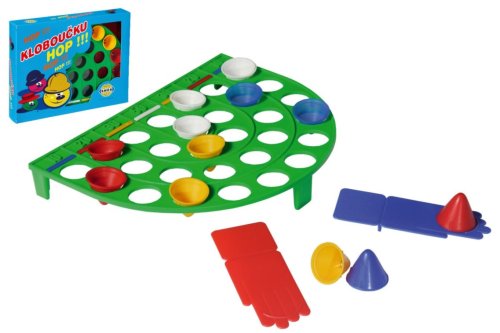 Klasická hra Kloboučku hop! Je určena pro malé i velké. Je to jednoduchá a zábavná hra, kdy se všichni hráči snaží co nejpřesnějším odpalem z rampy, dostat klobouček do děr hrací plochy a získat co nejvíce bodů. Tato hra je pro neomezený počet hráčů. Balení obsahuje hrací plochu, 2 vystřelovací rampy a barevné kloboučky. Doporučený věk 4+