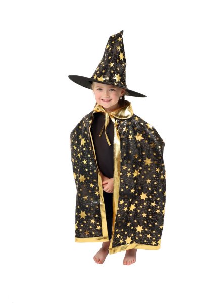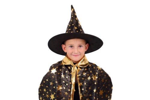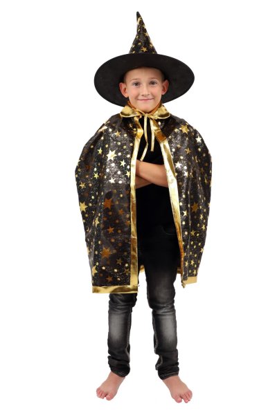 Dětský čarodějnický klobouk a plášť jsou inspirovány světem kouzel a magie. Mají černou barvu a jsou zdobené zlatými hvězdami, které vzbuzují čarodějnický dojem. Děti si mohou hrát na kouzelníky a kouzelnice, zkoumat svět kouzel a vytvářet své vlastní příběhy plné dobrodružství a fantazie. Čarodějnický klobouk s pláštěm jsou oblíbenou součástí karnevalových a halloweenských kostýmů. Není hračka