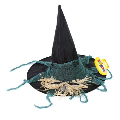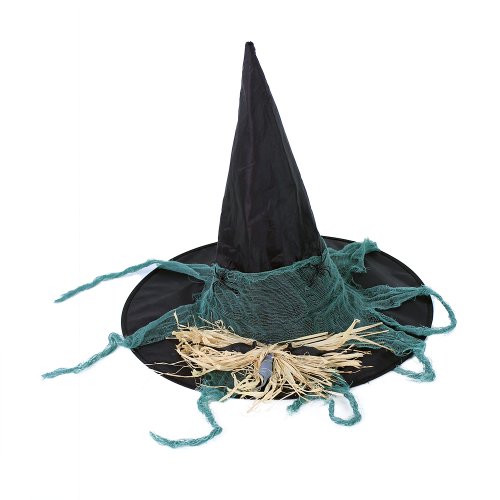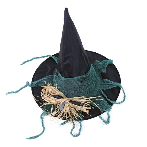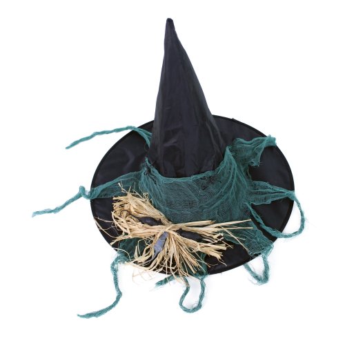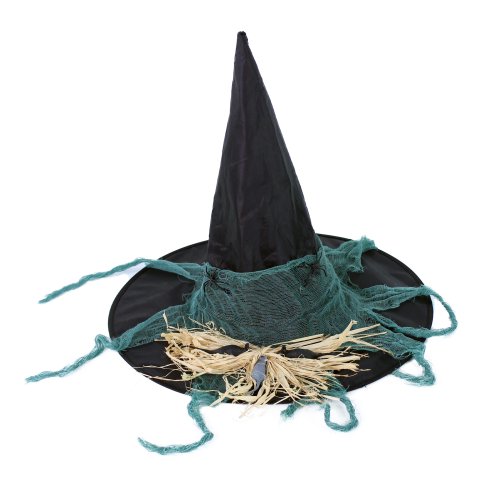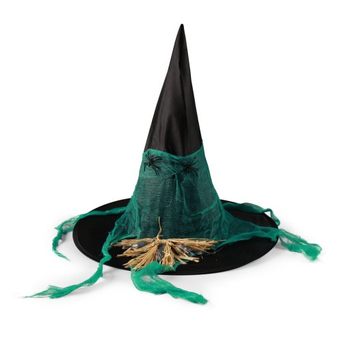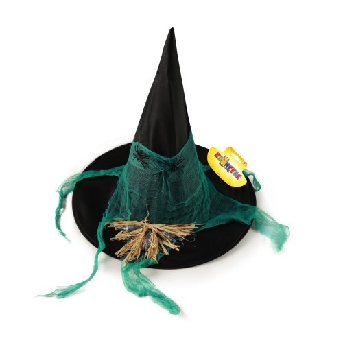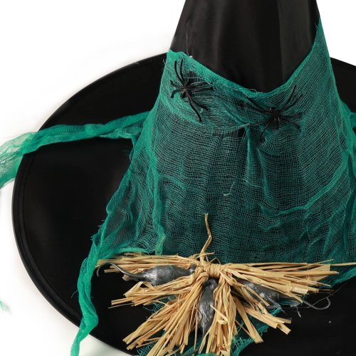 Stylový čarodějnický klobouk pro dospělé. Tento parádní kousek černé barvy je zdoben zelenou gázou a pavoučky. Staňte se hvězdou karnevalového/halloween večírku díky tomuto nepřehlédnutelnému klobouku a ohromte tak všechny své přátele!