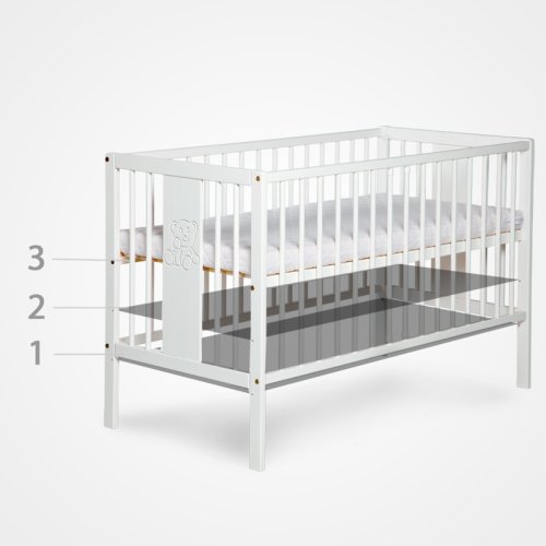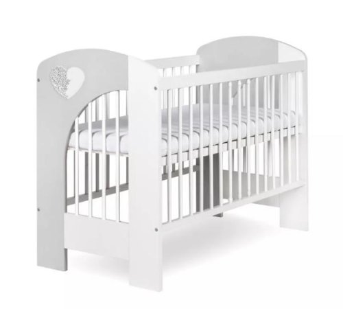 Stabilní dětská postýlka s aplikací srdíčka vyrobená z materiálů: eco + MDF + borovicové dřevo. Na kratším boku postýlky je umístěn znak informující o maximální tloušťce matrace, který je možné použít v nejvyšší poloze lůžkovém plochy postýlky.