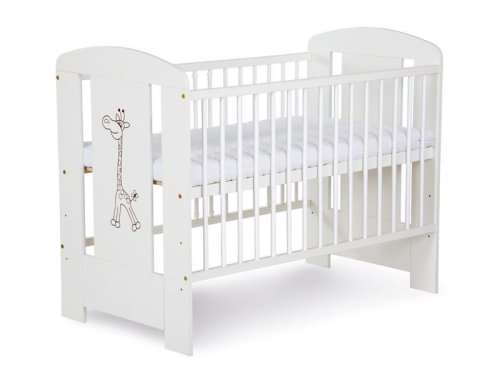 Stabilní dětská postýlka s aplikací žirafy vyrobena z borovicového dřeva.