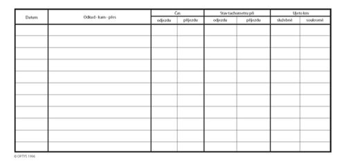 Kniha jízd firemního vozidla. Nepropisovací tiskopis. Blok obsahuje 32 listů, sešitová vazba V1. Nečíslovaný, zelenobílá obálka.Formát: 21 x 10cm