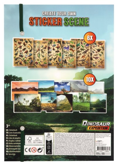 Kniha samolepek Dino + 10 obrázků v balení najdeš 6 aršíků samolepek s dinosaury a 10 obrázků krajiny velikosti A4. Nalepuj samolepky na obrázky a udělej si tak vlastní scenérii.