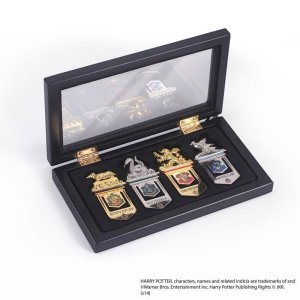 Set 4 záložek s erby a maskoty bradavických kolejí ve sběratelské krabičce.
