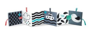Měkká knížka s černobílými ilustracemi, které pomáhají rozvíjet zrakové vnímání u kojenců během prvních měsíců života.