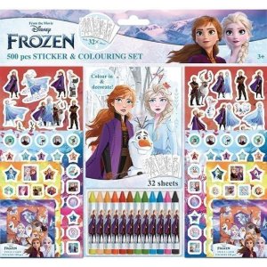 Set obsahuje téměř 500 různých druhů samolepek, blok (32 listů) ke psaní i malování a 12 voskovek.