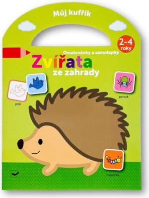 Knížka s pevnými stránkami je plná obrázků zvířat ze zahrady, které jsou částečně barevné.