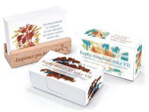 Další, již sedmá sada oblíbených dárkových karet s inspirujícími aforismy a meditativními obrazy, v této variantě s gravírovaným dřevěným stojánkem na vystavení kartiček.