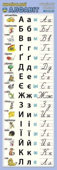 Záložka obsahuje přehledně zpracovanou ukrajinskou abecedu včetně výslovnosti a názorného obrázku.