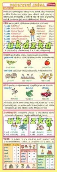 Praktická záložka obsahuje základní mluvnické kategorie podstatných jmen (pád, číslo, rod, životnost), dále vzory a rozdělení podstatných jmen (druhy).