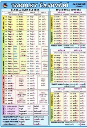 Přehledné tabulky všech německých časů sloves slabých, silných, způsobových a pomocných.