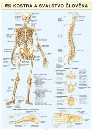 Barevné ilustrace lidského skeletu, svalstva a detaily jednotlivých částí těla.