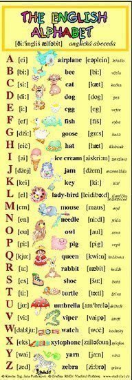 Přehled abecedy s přepisem anglické výslovnosti, slovem a obrázkem k zapamatování.