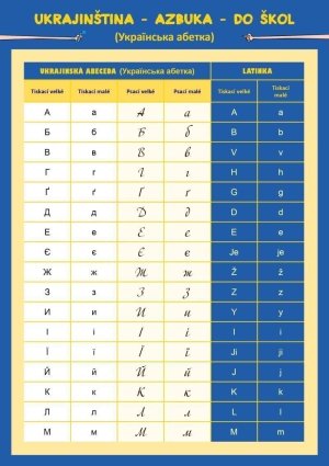 Tato naučná lamino kartička obsahuje základní přehled ukrajinské azbuky s jednoduchým a přehledným převodem do českého jazyka.